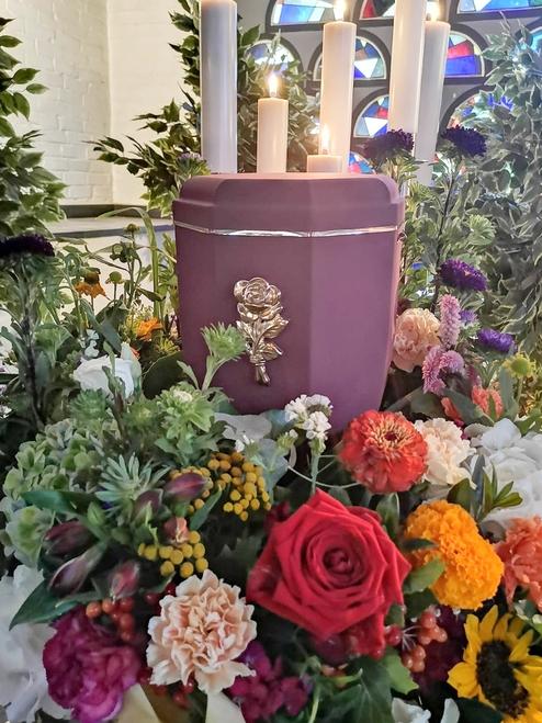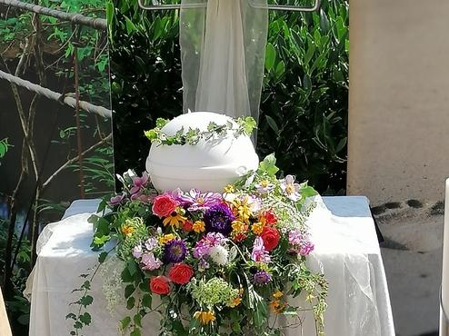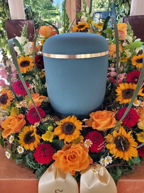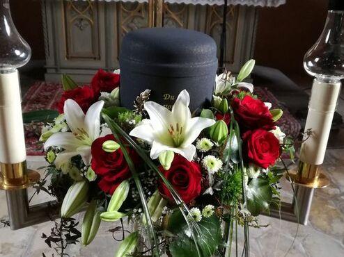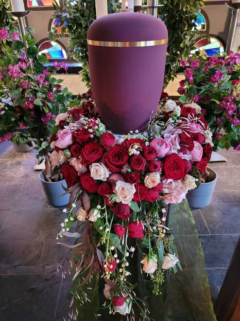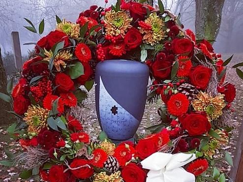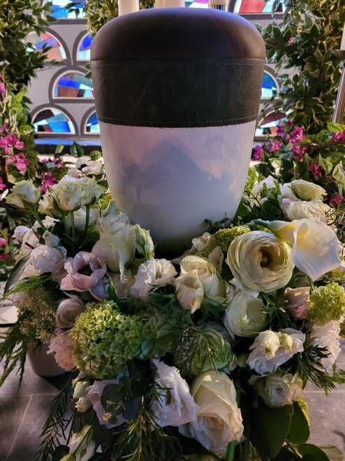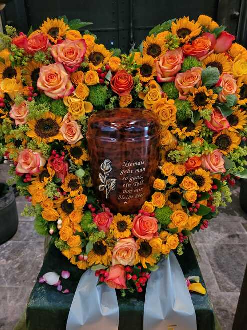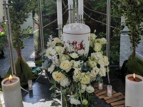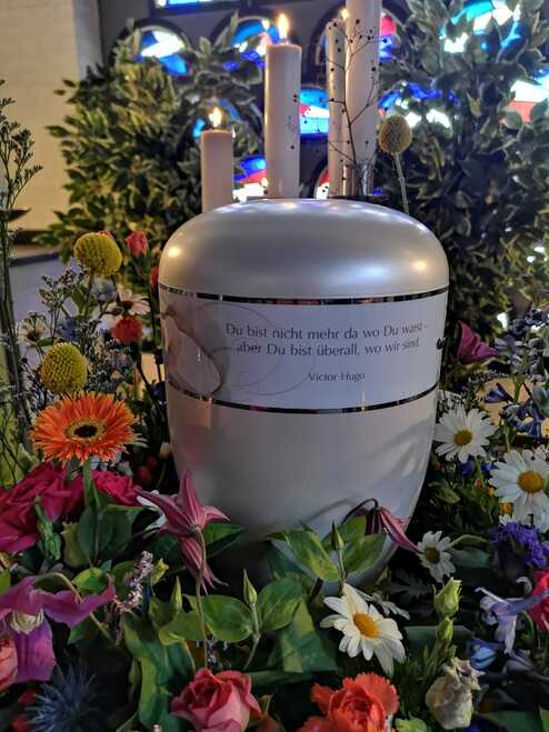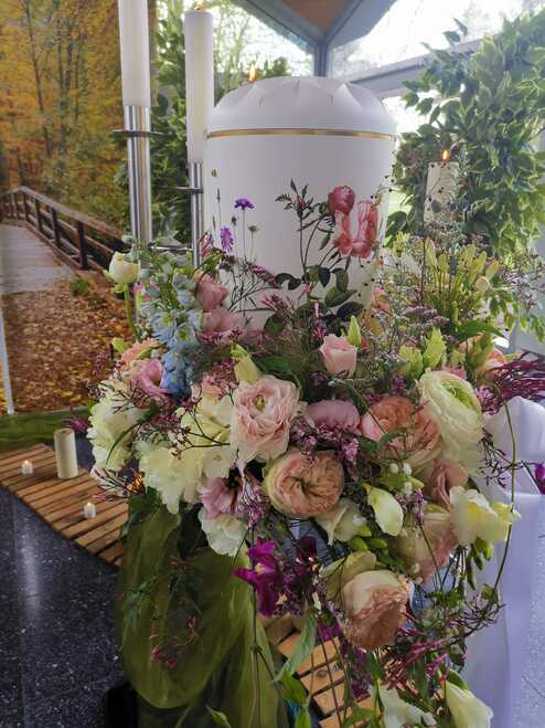 Ein Urnenkranz wird bei der Trauerfeier zentral um die Urne gelegt, er soll die Urne letztlich schmücken und nach Wunsch durch eine Schleife mit einer letzten Botschaft versehen sein. Die Trauerschleife kann eine Botschaft, die Namen der Familie oder ein Zitet enthalten. Ganz individuel knnen sie hier entscheiden welche Beschriftung zu setzen ist.