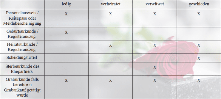 Tritt ein Trauerfall ein müssen dennoch einige Formale Dinge geklärt werden. Wir von Bestattungen Hanke Rüsselsheim unterstützen Sie dabei. Je nach Familienstand werden unterschiedliche Unterlagen als Nachweiß von nöten.